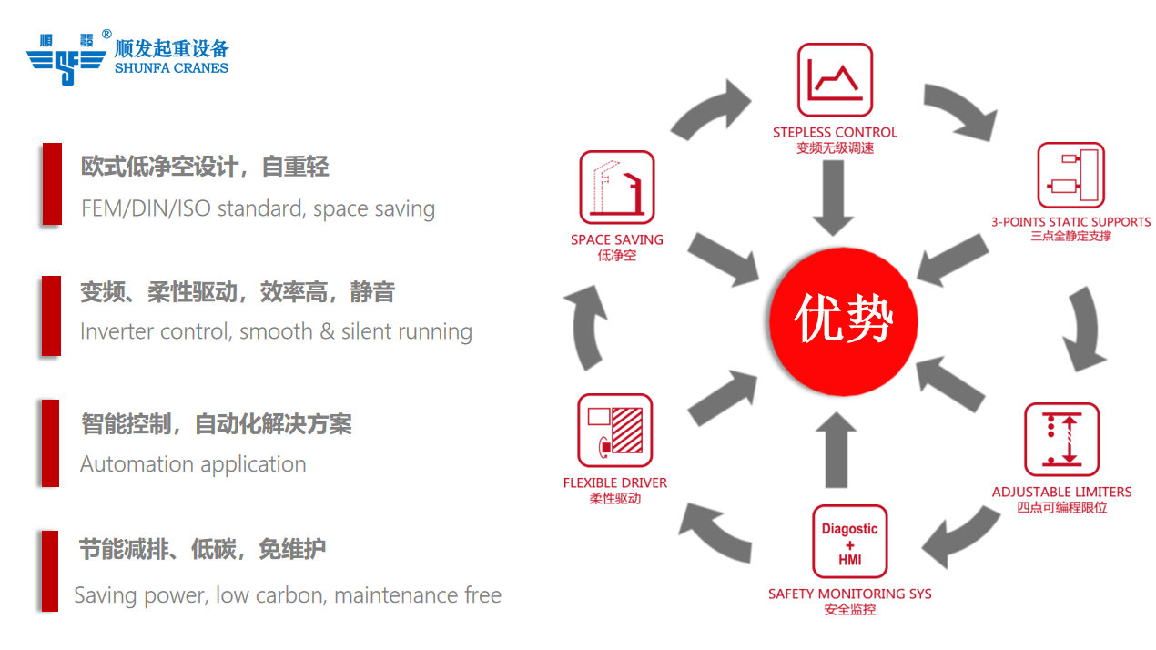 歐式雙梁橋式起重機(jī)是基于歐洲輕量化和模塊化設(shè)計(jì)理念以及先進(jìn)生產(chǎn)制造工藝,在橋架上設(shè)置一臺(tái)小車及起升機(jī)構(gòu),小車可以前后運(yùn)行,大車運(yùn)行等機(jī)構(gòu),實(shí)現(xiàn)物料物體在立體空間搬運(yùn),使整個(gè)起重機(jī)的結(jié)構(gòu)緊湊,運(yùn)行平穩(wěn),自重減輕,高度降低,節(jié)能減耗,大大減少用戶對(duì)起重機(jī)運(yùn)行廠房的建造成本和起重機(jī)運(yùn)行費(fèi)用,提高起重機(jī)的整機(jī)品質(zhì)和運(yùn)行性能。