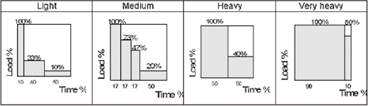 Light Occasional full load Usually light load Small fixed load | Medium Occasional full load Usually light load Average fixed load | Heavy Repetitive full load Usually average load Heavy fixed load | Very Heavy