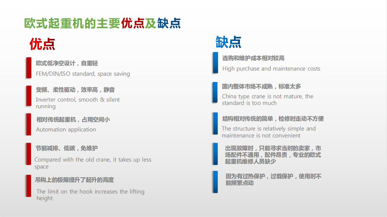 總的來說,歐式起重機(jī)是一種先進(jìn)的起重設(shè)備,具有很高的效率和安全性,但也存在一些限制和缺點(diǎn)。用戶在選擇時(shí)需要根據(jù)自身的需求和環(huán)境進(jìn)行綜合考慮。