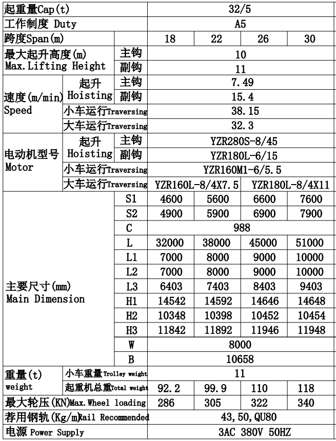 MG型通用32t門式起重機屬雙主梁通用門式起重機,也稱A型32t雙梁龍門吊,由橋架、大車運行機構、小車、電氣設備等部分構成。本32t起重機是按照GB/T14406-1993《通用門式起重機》設計制造,起重量32t,工作環(huán)境為-20~+40℃,工作級別A5、A6兩種。